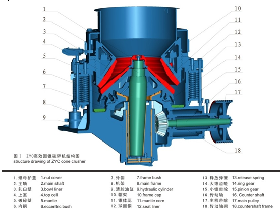 破碎腔:两个破碎元件形成的空间内部结构,是圆锥破碎机破碎物料的地方;